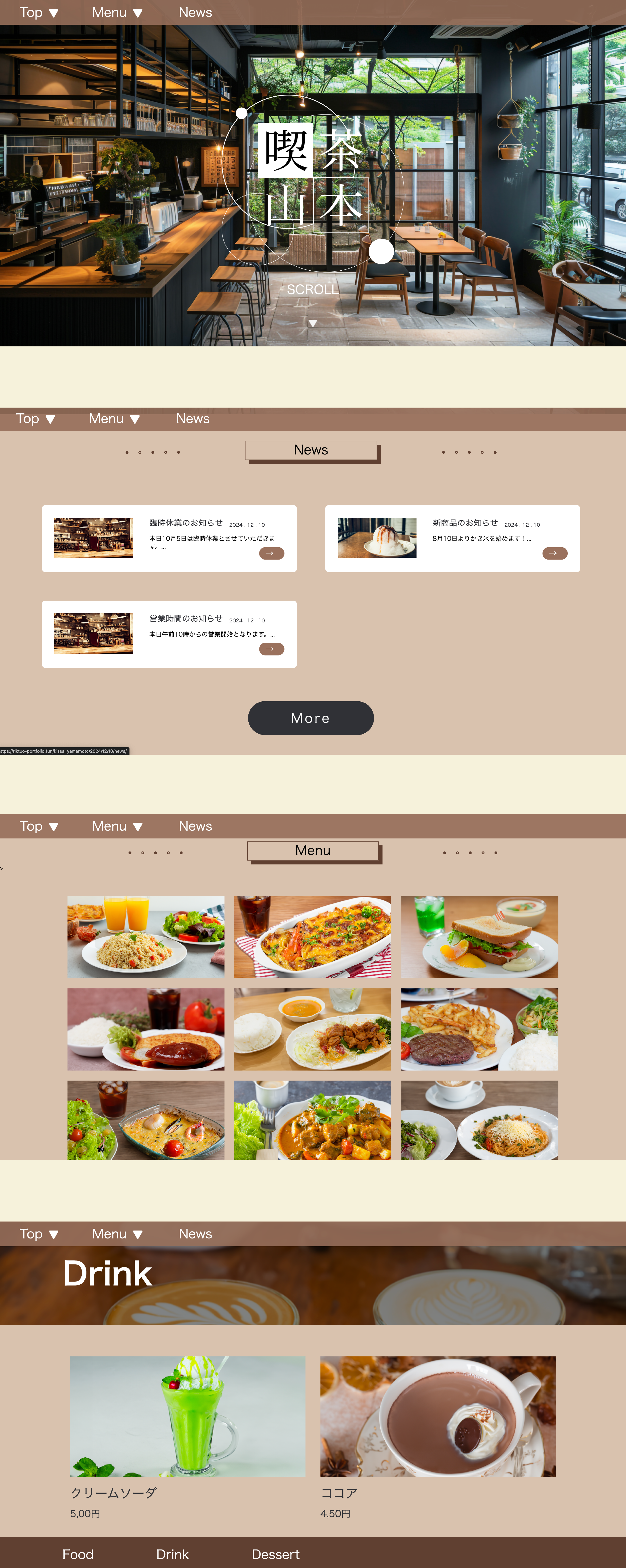 - 幅広い年齢の方々が利用される喫茶店を想定したため、使いやすいサイトを目指しました。配色には特に気を使い、レトロな雰囲気を演出しつつも、商品が映える配色を心がけました。